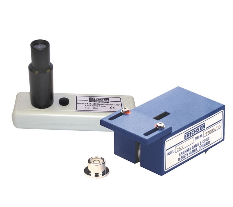 The Model 263 indentation hardness tester consists of a metal block in which two pointed feet and the indenter are mounted. The indenter, made of hardened steel, is a wheel with a cutting-shaped (120°) ground edge. The total mass of the tester is 1000 ±5 g. The test load is set in the range of 4.90 N to 4.95 N (corresponding to 500 to 505 g). Thus, it meets the requirements of all standards. The measuring microscope has 20x magnification and built-in illumination. It has a measuring range of 4 mm with a pitch of 0.1 mm.